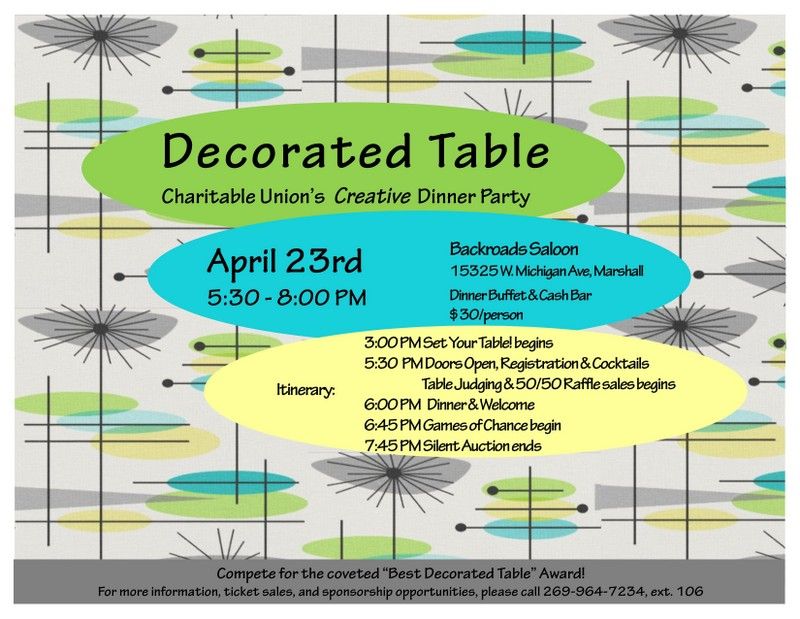 Join us for Decorated Table, the Charitable Union’s Creative Dinner Party. Occurring April 23rd at the Backroads Saloon, Decorated Table is a chance to “play” with friends, drink a little wine, and help the Charitable Union raise funds.